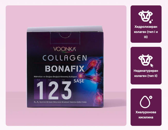 Voonka Collagen Bonafix е премиум продукт, създаден за хора с проблеми в костите и ставите. Той съдържа хидролизиран колаген тип I, II и III, допълнен с витамин C, витамин D3, глюкозамин, хондроитин, MSM, хиалуронова киселина, куркума и дяволски нокът. Това го прави един от най-пълноценните продукти на пазара.
