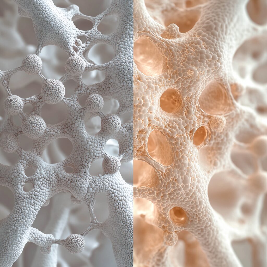 Остеопорозата е заболяване, при което костната плътност намалява и костите стават крехки и податливи на счупвания. Поради бавното и незабележимо прогресиране, тя често е наричана „тихият убиец“. След 30-годишна възраст естественият синтез на костна тъкан отслабва, което води до постепенна загуба на костна маса. Традиционните препоръки за здрава костна система включват прием на калций и витамин D, но все повече специалисти изтъкват значението на колагена за здравето на костите. Лекарите съветват да „зареждаме“ организма си с колаген като част от превенцията на остеопороза.