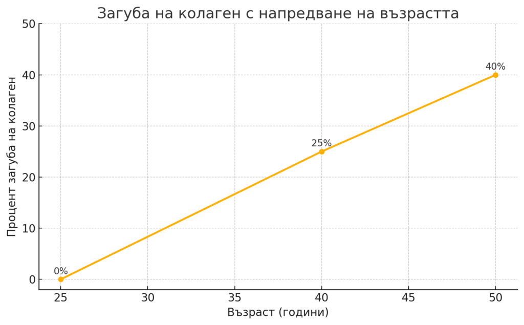 - До 40 г. виждаме загуба от около 25% от общия колаген.