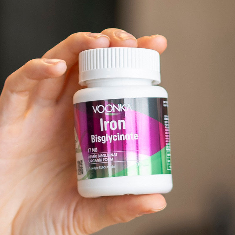 Voonka Iron Bisglycinate - желязо е жизненоважен елемент, който участва в преноса на кислород в кръвта и допринася за нормалните енергийни нива на тялото