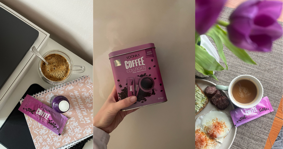 „Защо не пробваш кафето си по друг начин? Аз така върнах енергията си. Знаеш колко много обичам чай следобед, добавям го дори и в него!“ И извади от чантата си една малка и стилна опаковка – Voonka Coffee Collagen.